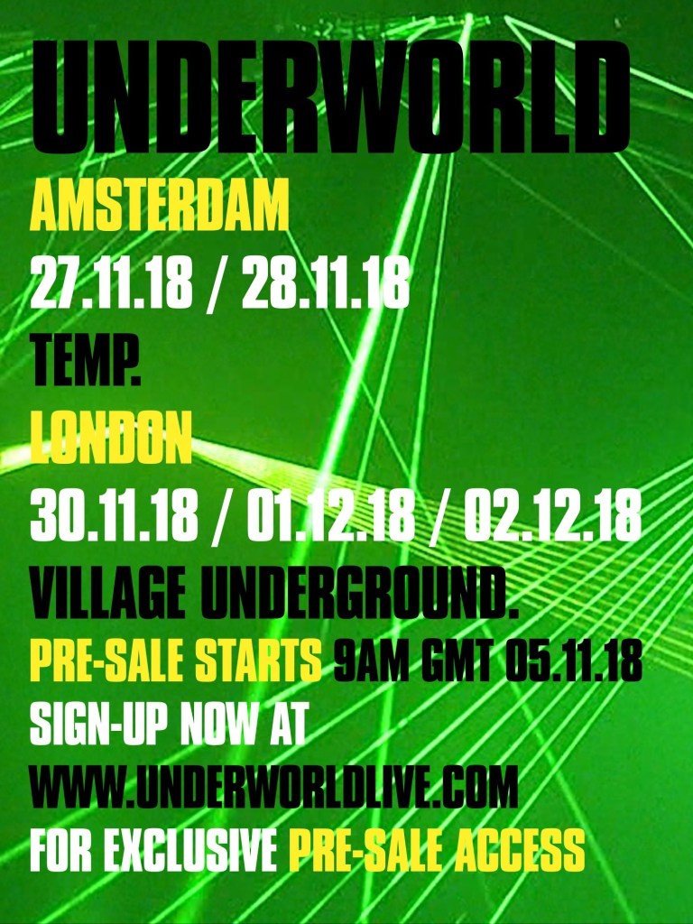 At these new shows, Underworld will be experimenting with a mix of brand-new material, classic tracks and little heard gems from their deep archive: “In 2017 we reconnected with a personal joy of performing in small venues when Karl & I took our show to the Zepp club in Osaka prior to headlining Ultra festival in Tokyo. The whole experience was so deeply inspiring we just had to do it again.” Rick Smith 27th November Amsterdam, Temp (with DGTL) 7pm – 11pm TBC 28th November Amsterdam, Temp (with DGTL) 7pm – 11pm TBC 30th November London, Village Underground (with Bugged Out) 9pm – 4am 1st December London, Village Underground (with Bugged Out) 9pm – 4am 2nd December London, Village Underground (with Bugged Out) 7.30pm – 11.30pm A ticket pre-sale for both the Amsterdam and London shows will be available from 9am GMT / 10am CET on November 5th, exclusively to those who sign up here. Remaining tickets will be available via general sale at 9am GMT / 10am CET on November 7th. Last edited by darkvoice; 11-01-2018 at 03:43 AM. |