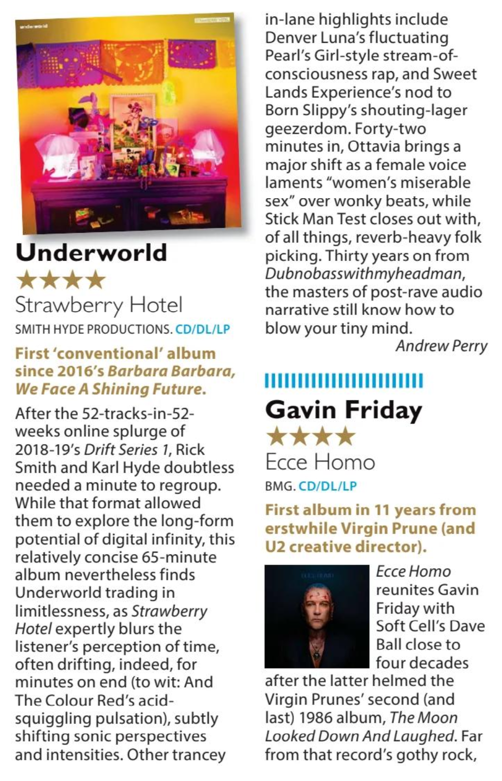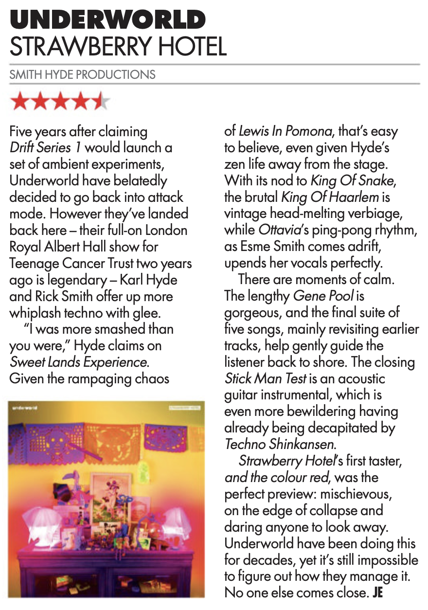 It makes sense, for Strawberry Hotel has a very satisfying ebb and flow, its variety of musical styles greater than any Underworld album up to this point. [. . .] Little has changed with the Underworld formula in recent years, the euphoric chord shifts and slowly oscillating, atmospheric chords still working their magic. denver luna is a beauty, its central breakdown like a superimposed chant from the back of a church. Techno Shinkansen channels 1999’s King Of Snake, with a typically airy synth riff to work its magic, while Hilo Sky is a younger cousin of Always Loved A Film.