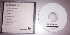 Tracks: 1. No Move 6'53 2. Two Months Off 9'07 3. Twist 6'24 4. Sola Sistim 6'26 5. Little Speaker 8'36 7. Ess Gee 2'20 8. Dinosua Adventure 3D 7'55 9. Ballet Lane 3'39 10. Luetin 7'00 please note: this is how the tracks are listed on the CD (and do not include any spelling mistakes) there is not a great deal different about this CD, the track listing and track times are exactly the same as the standard issued 'A Hundred DAYS Off', but this CD Promo must have been one of the first off the presses...as it 'was' labelled 'A Hundred Years', both on the Slip Notes & CD The Inner Slip Sleeve, which details the Artist : Underworld the title : A Hundred Days Off* the track listing: (as spelled above) * this is a sticker over the top of the original title ' A Hundred Years ' - the proposed original title for the Album...which had obviously been corrected in time for this to be issued to DJ's it wasn't a typo, thats for sure, because on the CD-R itself the words 'A Hundred Years' can be seen clearly through a hurridely crossed out black mark, and no new name has been added...it just reads UNDERWORLD A Hundred Years (sribbled through) 10 Tracks and these have been printed on the white CD-R, and not written on, so it muct have been a last minute change... well its rare for the fact that its a 'released' item with incorrect details that have been corrected, and proof that A Hundred Days Off was not the original title, until the last minute.... i've not seen or heard of any other versions with miss labelled info on them, unless you lot know any different.... Year of Release: 2002 Current Price: £30+ Desirability: 5/10 - one for the collector freaks ![]() Availability: 1/10 - sorry, but i reckon that i must have the only copy, unless anyone knows any better...there must be some mastered versions out there with different mixes...surely...and some labelled incorrectly and not corrected? Picture: