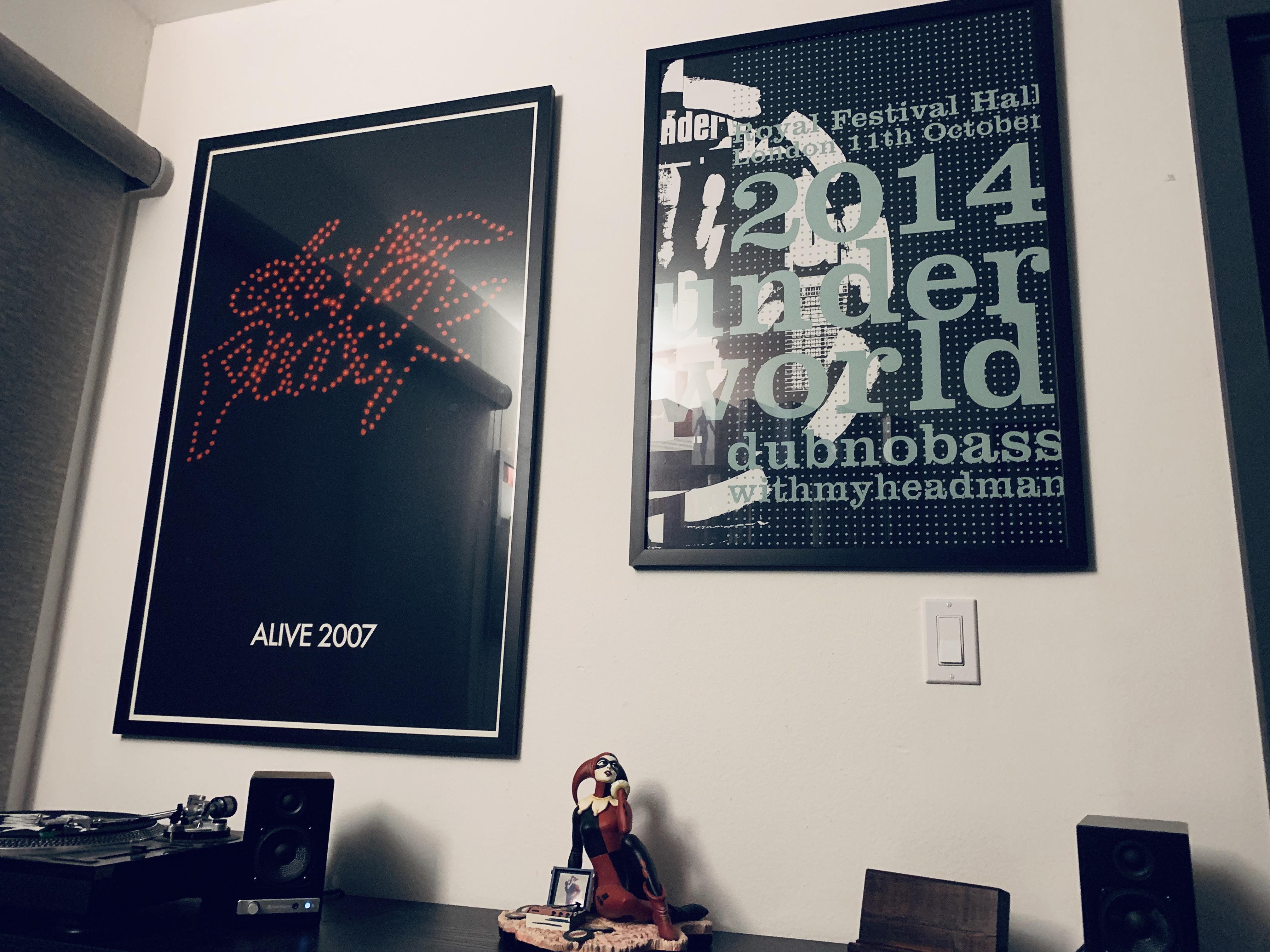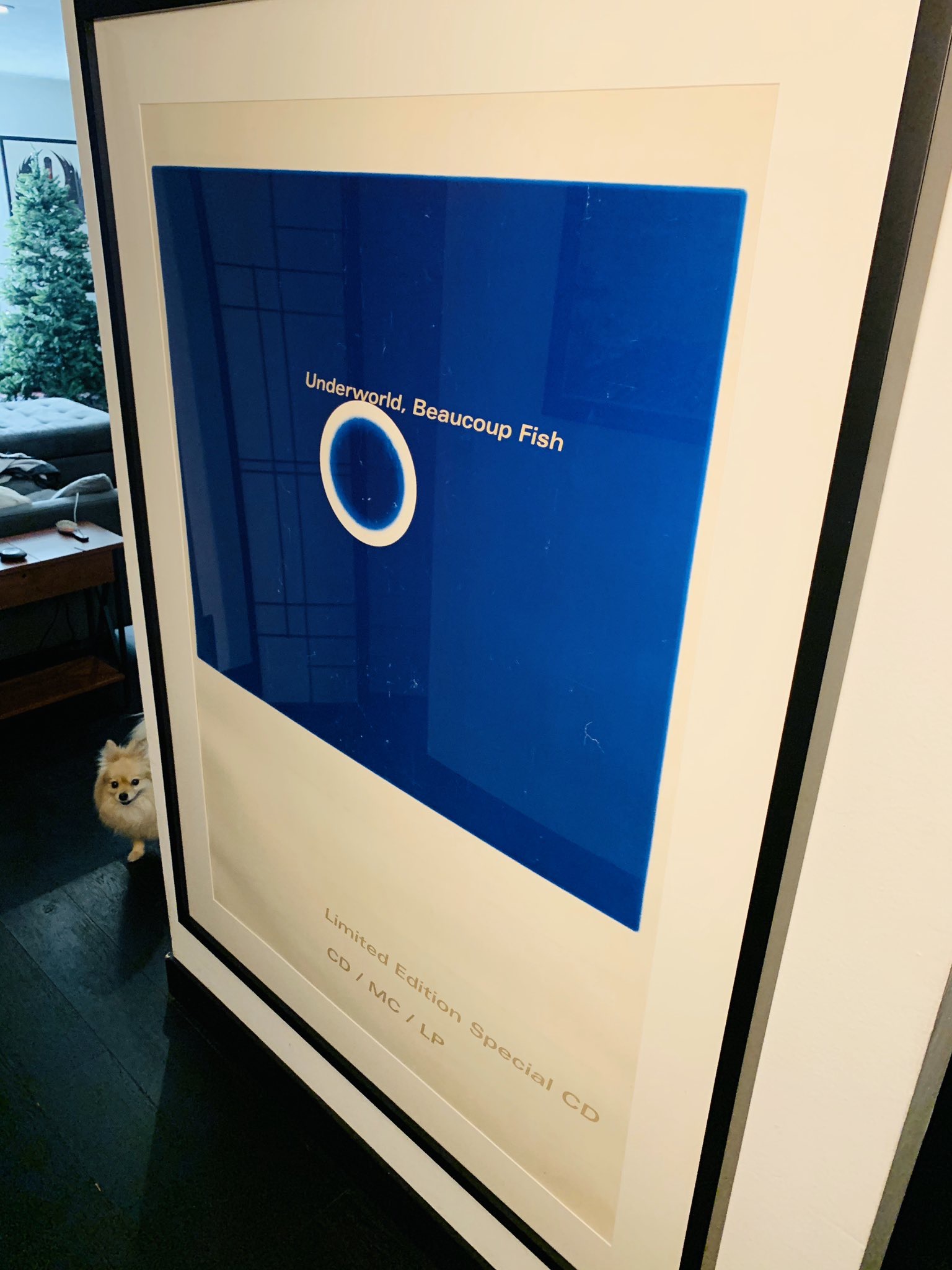 Finally got around to framing some old, even very old artwork. I bought this Underworld poster at the Dubnobass anniversary gig in London; still one of my favorite experiences (thanks again to those of you who were there and made feel welcome in the UK!). The poster had been in my flat file for years but is in very good company now.